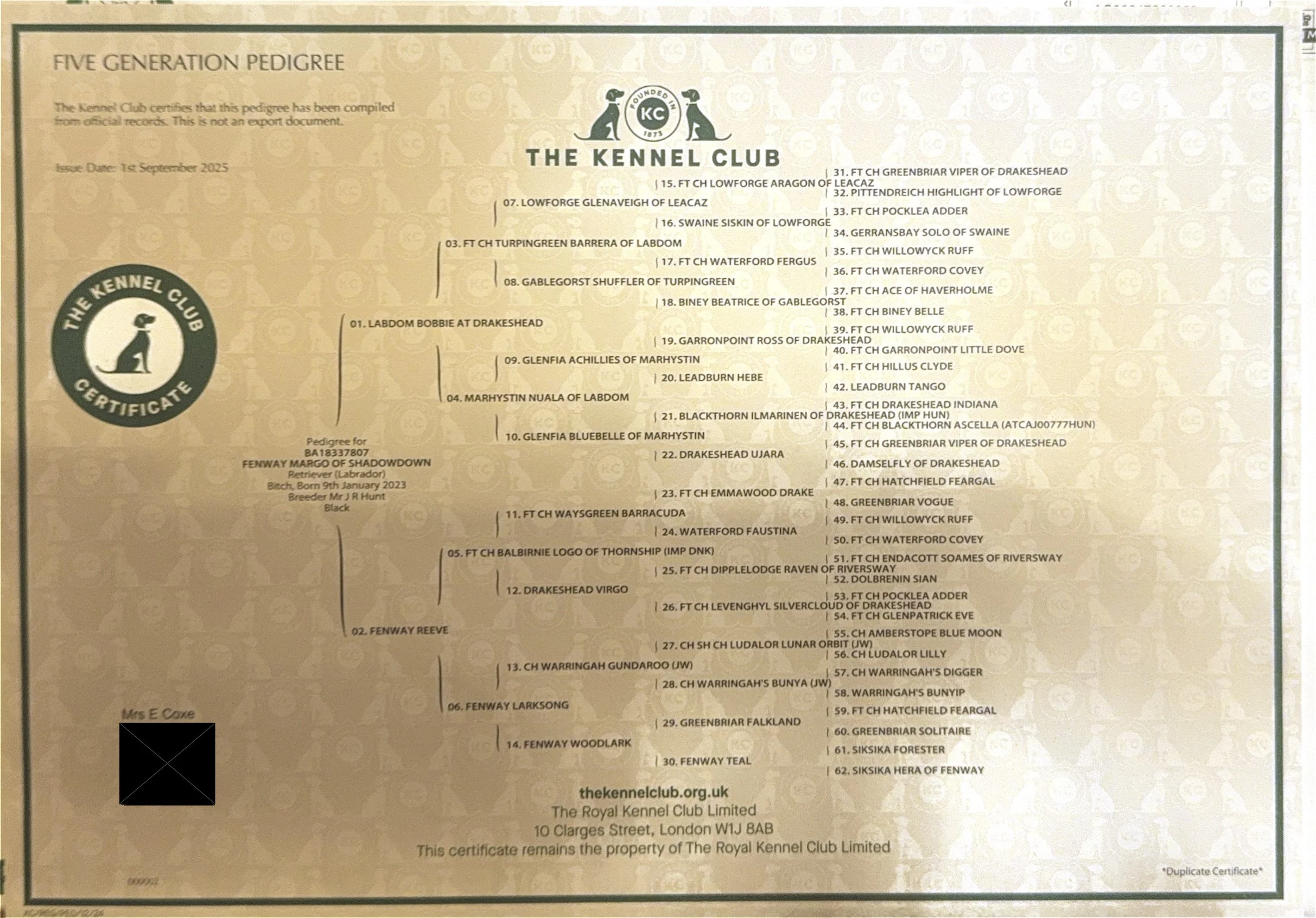 Her sire, Labdom Bobbie at Drakeshead, has numerous notable influences throughout his pedgree with multiple FT Ch/FTW.